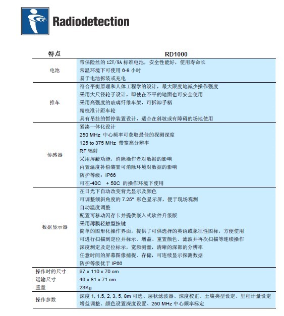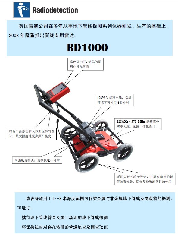 地下管道探測雷達RD1000 面對當今日益復(fù)雜擁擠、金屬和非金屬交織的地下管線網(wǎng),地下管線探測人員有時感到很無助。全世界各地的測繪人員都在尋求一種不需要挖掘便能輕松看到地下管線埋藏狀況的工具。英國雷迪公司就是為了滿足測繪工作者的這一需求,推出了RD1000探地雷達系統(tǒng),它能讓世界各國的地下探測工作者清楚地看到地下的各種管線,包括塑料管道,可在任何地形環(huán)境中輕松使用,重量不到23公斤,只需兩分鐘就可安裝使用,拆裝容易,便于運輸。模塊式設(shè)計,維護、維修方便,RD1000™定位性能優(yōu)越,強大的數(shù)字信息處理系統(tǒng)可實時、清楚地顯示地下剖面圖。數(shù)碼顏色和數(shù)字增益控制最大限度地提高了定位質(zhì)量,先進的數(shù)字濾波可濾除干擾信號,從而大大提高了定位準確度,操作簡單,LCD顯示屏配有直觀的鍵盤和菜單系統(tǒng),為操作人員提供各種應(yīng)用功能。只需向后拉動雷達車,便可進行定位,定位模式下可抓拍到地下實時剖面圖,光標顯示底下管道的深度和位置,圖像存儲在閃存卡上,同時閃存卡接口還可讓用戶進行固件升級。